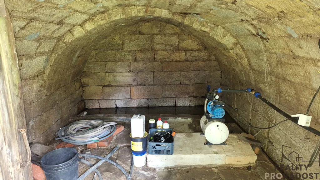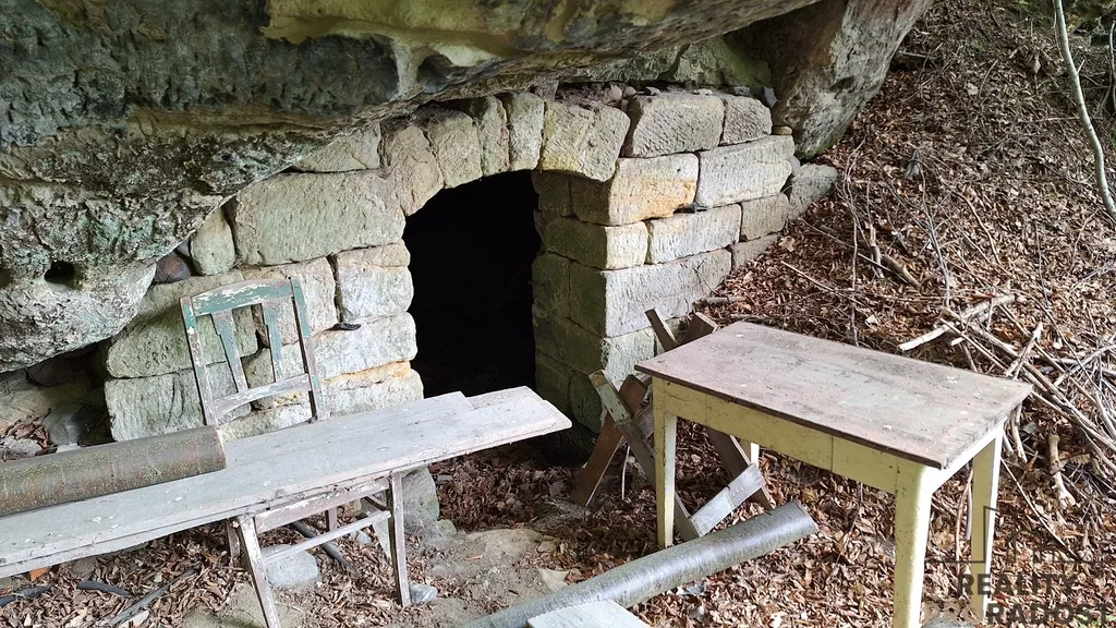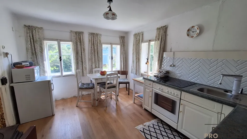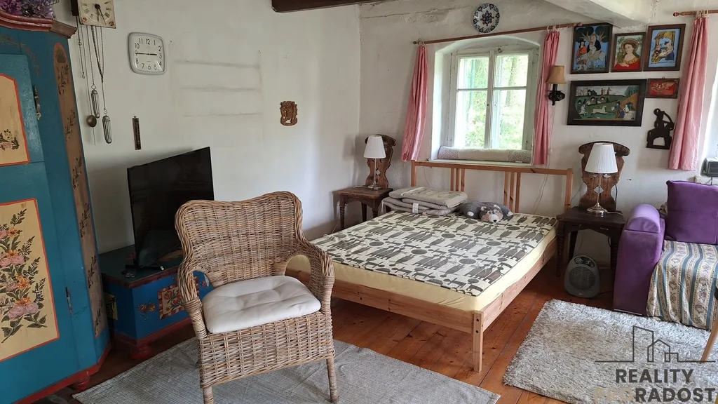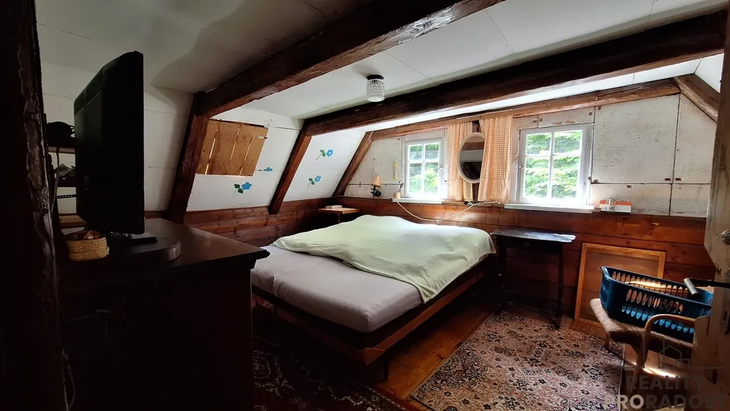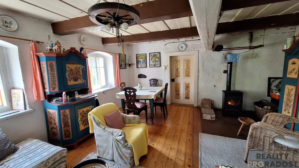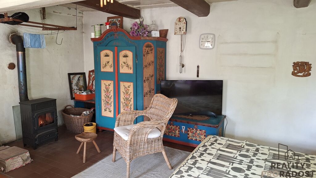 V přízemí se vchází do vstupní chodby, na jedné straně je obývací pokoj s krbovými kamny, dřevěnou podlahou a vkusně zařízeným nábytkem, na druhé straně je kuchyň. Z chodby je vstup na WC, a do technické místnosti pro skladování materiálu, dřeva, popřípadě je zde možnost využití malé dílny. Do koupelny je vstup z kuchyně, koupelna je vybavena sprchovým koutem, ohřev teplé vody je zajištěn elektrickým bojlerem. V koupelně je instalována klimatizace, která zajistí tepelnou pohodu v koupelně i v kuchyni současně. V horní části chaty je obytné podkroví, využívané pro spaní. Velkou předností je zahrada o ploše 898 m² plus lesní pozemek, kde jsou skalní sklepy a převisy. Pozemek je samostatný a poskytuje dostatek soukromí a klidu. Elektroinstalace je po rekonstrukci v mědi, vodoinstalace je již v plastu a odvod odpadní vody je do zrekonstruovaného septiku. Zdroj pitné vody je na pozemku pramenitou vodou zavedenou do domu.