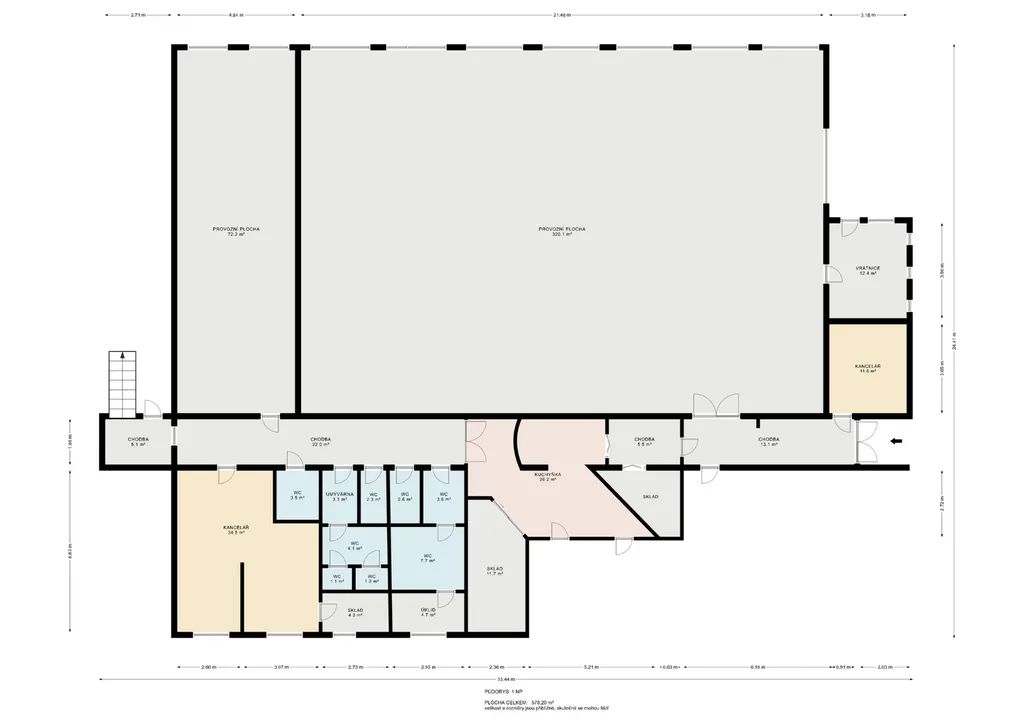 - Skladová hala o výměře 300 m² (rozměry 14,5 x 20,4 m) se světlou výškou 7,5 m