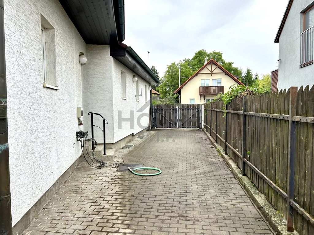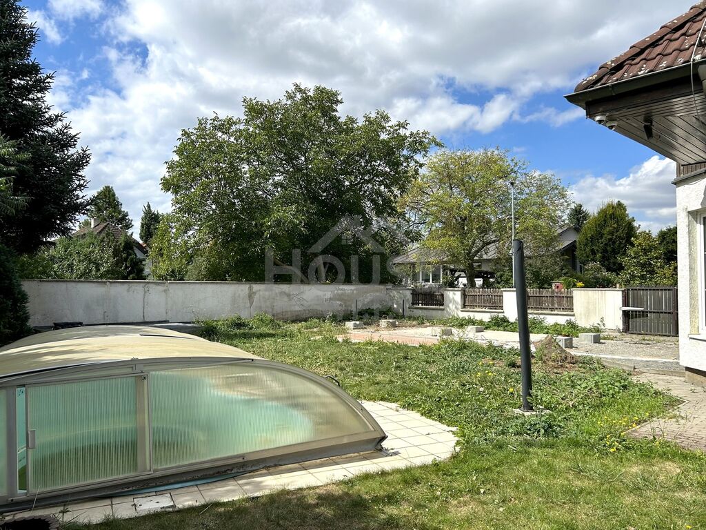 Exteriér a lokalita: Udržovaná zahrada s bazénem a plným soukromím. Parkování na pozemku. Klidná ulice s výhledem na pole – ideální pro rodinné bydlení.
