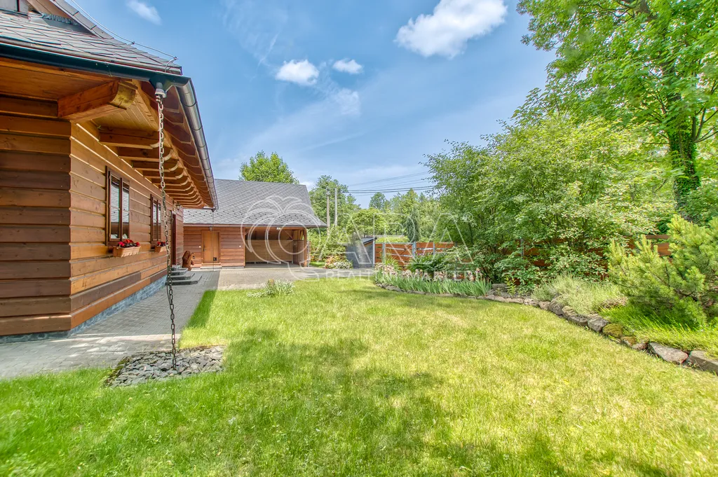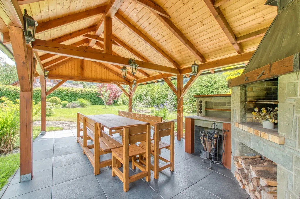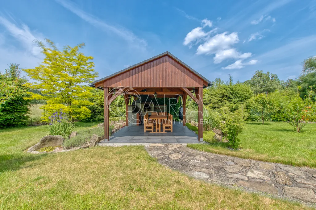 Okrasná zahrada s ovocnými keři a lipová terasa s posezením a krbem nabízejí dokonalé soukromí a prostor pro relaxaci. Koupací sud pro 4-6 osob a dílna pro zahradní nářadí jsou třešničkou na dortu. Celý pozemek je obehnán masivním jasanovým plotem, který zajišťuje pocit bezpečí.