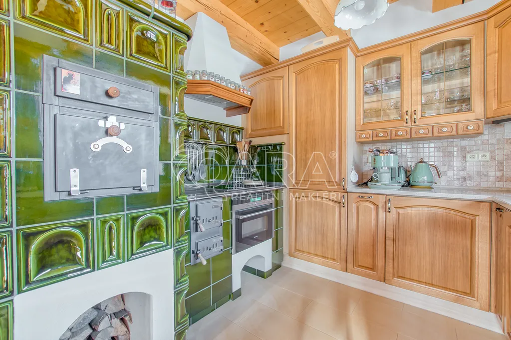 Již při vstupu vás okouzlí dominantní obývací pokoj s krbem a kuchyní, kde se stylová kachlová kamna stávají srdcem domova. Nadstandardní vybavení značkovými spotřebiči a promyšlené designové prvky svědčí o nekompromisní kvalitě a vkusu majitelky, která se o tento dům s láskou stará od jeho výstavby.