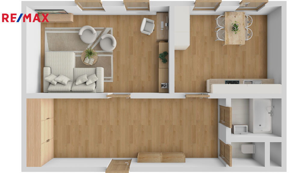 Byt o celkové ploše cca 40 m² se nachází v prvním patře budovy s výtahem a je bezbariérový. Dispozici tvoří obývací pokoj s kuchyňským koutem, samostatná ložnice, koupelna s vanou a samostatné WC. Jednotka je v udržovaném stavu a nabízí okamžitý výnos z pronájmu nebo možnost vlastního využití.