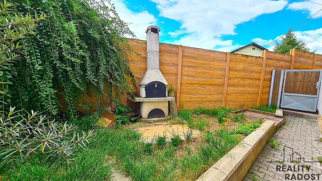 Zahrada má ideální velikost pro venkovní aktivity. Nachází se na ni zahradní krb a zahradní domeček využívaný jako sklad nářadí. Dvůr za domem je vydlážděný a z velké části krytý pergolou s posezením. Celý pozemek je oplocený. Před vchodem do domu je dlážděná parkovací plocha pro 2 auta s vjezdem a bránou na dálkové ovládání.