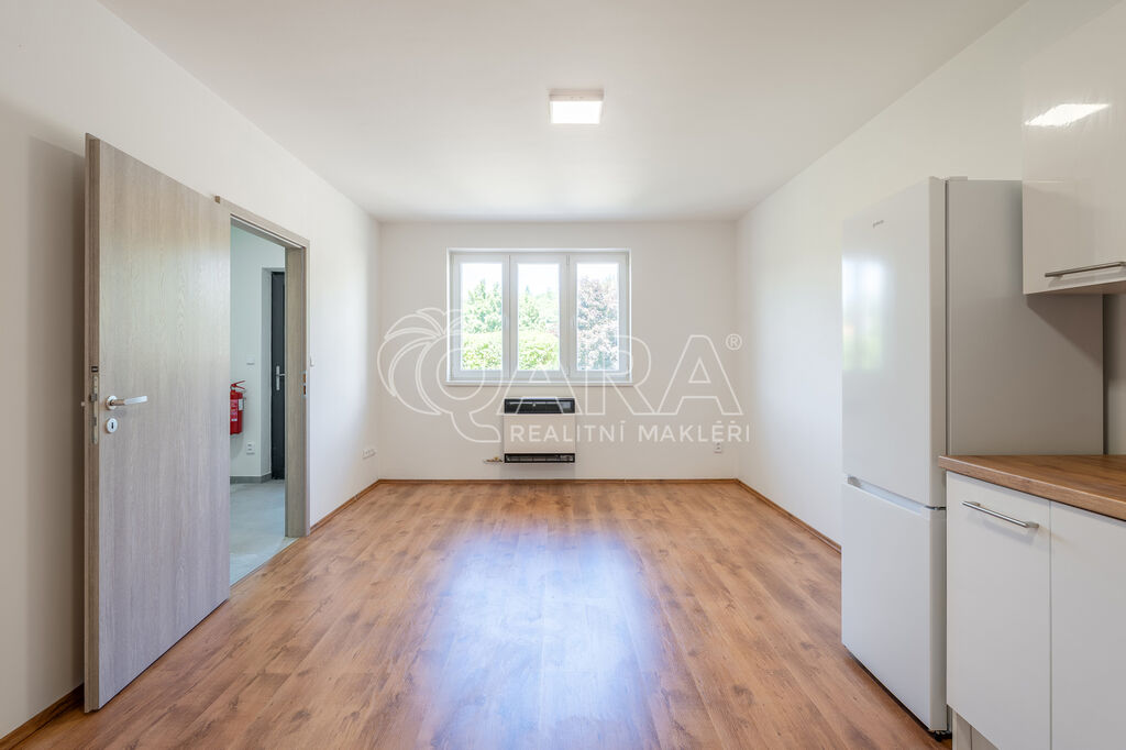Ateliér o podlahové ploše 33,35 m² se nachází v 1. nadzemním podlaží (přízemí) cihlového domu. Skládá se ze zádveří o výměře 4,7 m², ze kterého vstoupíte do hlavní místnosti o výměře 24,1 m². Součástí je nová kuchyňská linka se spotřebiči (elektrickou troubou, varnou deskou, digestoří a lednicí s mrazákem a přípojkou na pračku). Ateliér je vhodný nejen k bydlení, ale i pro dočasné ubytování nebo komerční využití. Koupelna je vybavena prostorným sprchovým koutem, umyvadlem se skříňkou, zrcadlem a WC.