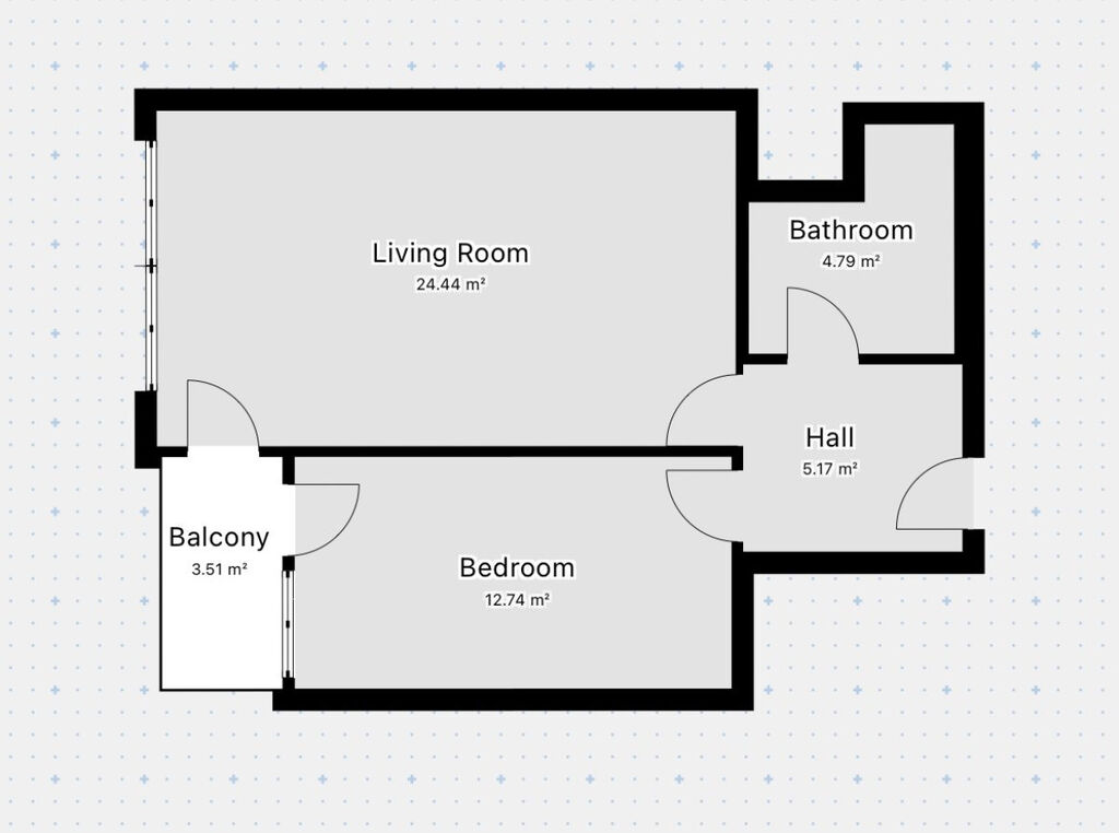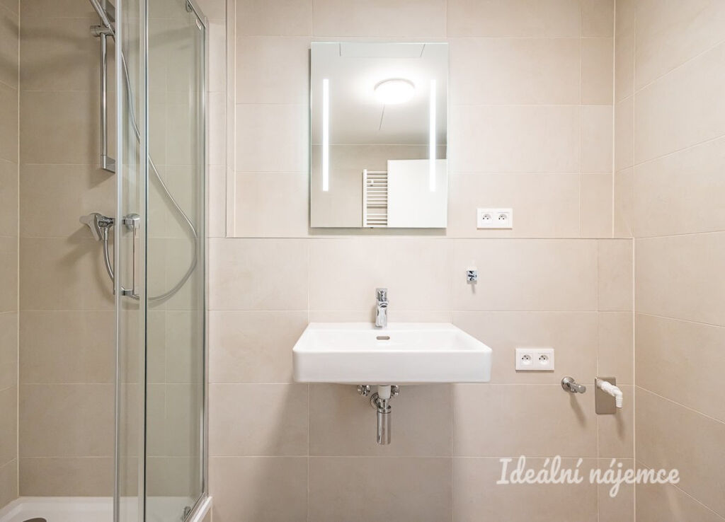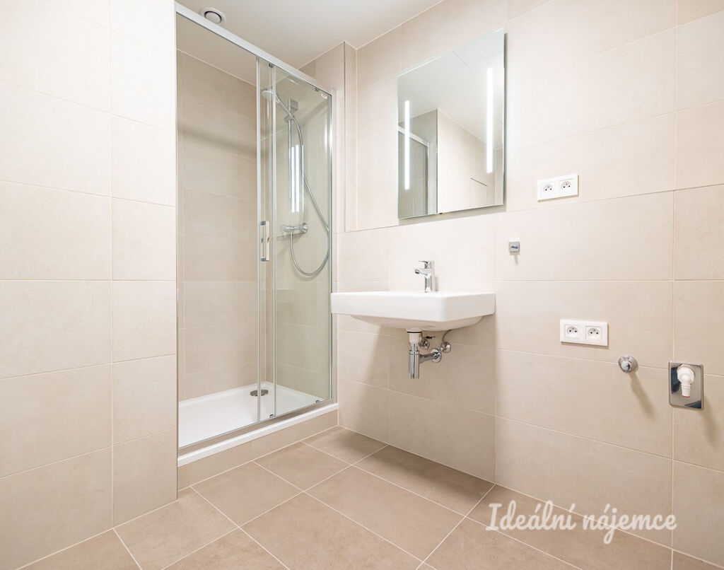 V předsíni se nachází vestavěná šatní skříň s věšákem. Z předsíně se dostaneme do obývacího pokoje s kuchyňským koutem. Kuchyně se nabízí plně vybavena vestavnými spotřebiči - lednice s mrazákem, myčka nádobí, indukční varná deska, elektrická trouba a digestoř značek Electrolux a Liebherr. Obývací pokoj i ložnice jsou nezařízené. V koupelně se nachází sprchový kout, závěsná sanita a přípojka s vývodem na pračku. Okna jsou zde kvalitní trojskla s výbornou tepelnou i zvukovou izolací.