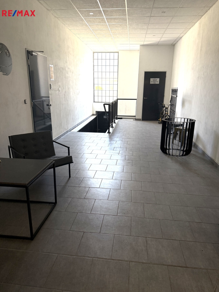 chodba se vstupem přes dveře o výměře 12 m2, kancelář č. 2 o výměře 20 m2, zadní garáž přístupná