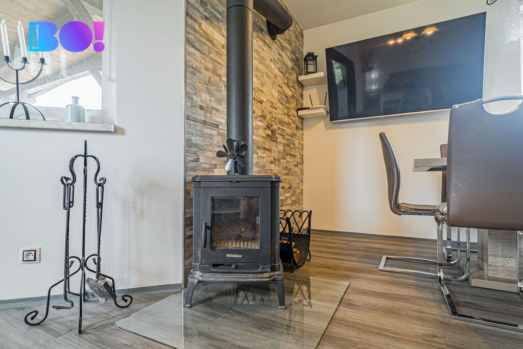 Dům je vybaven podlahovým vytápěním a kamny, napojen na vodovod a kanalizaci.