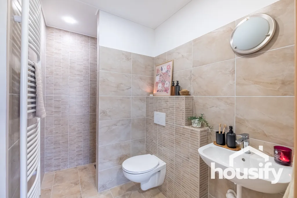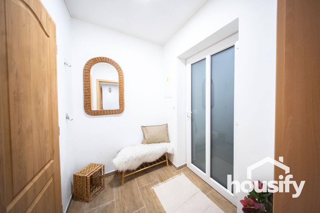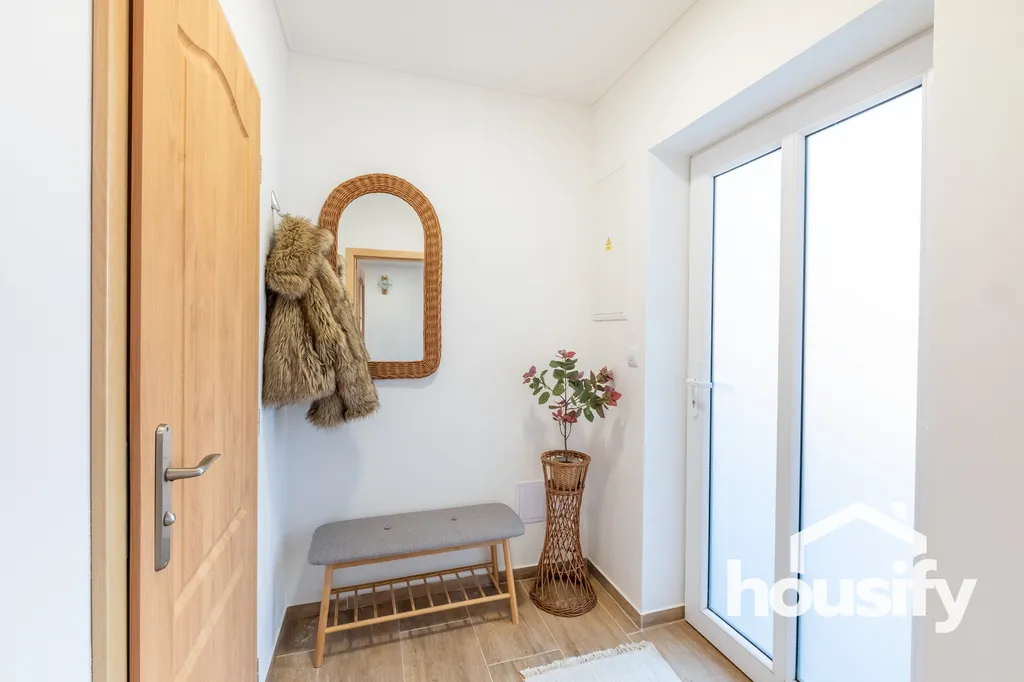 Hned při vstupu do bytu vás přivítá útulná předsíň, ze které se dostanete do koupelny s toaletou. Koupelna je vybavena moderním walk-in sprchovým koutem, otopným žebříkem a přípojkou na pračku, v koupelně se nachází také plynový kotel. Hlavní obytnou část tvoří prostorný obývací pokoj propojený s kuchyní. Kuchyňská linka je vybavena moderními spotřebiči, včetně trouby, indukční desky a digestoře. Obývací prostor působí díky zvýšenému stropu až do úvrati velmi vzdušně a moderně. Z obývacího pokoje pak vstoupíte do ložnice, která je situována tak, aby poskytovala maximální klid a výhled do zahrady.