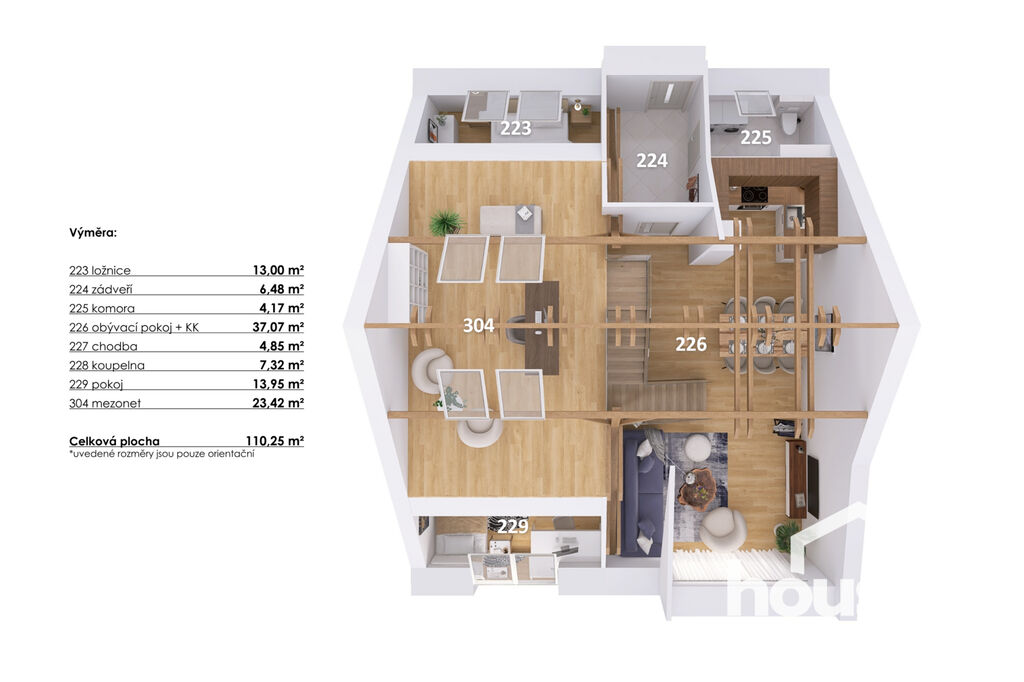 Hlavní obytná část o rozloze 42 m² spojuje otevřený mezonet, obývací pokoj a kuchyňský kout. Výjimečnou atmosféru tohoto prostoru vytváří kombinace minimalistických detailů, industriálního kovového schodiště a hřejivosti přírodních materiálů, jako jsou dřevěné trámy. Pečlivé propojení těchto prvků dodává interiéru nezaměnitelný charakter. Další komfort zajistí dvě samostatné ložnice a dvě koupelny s toaletou.