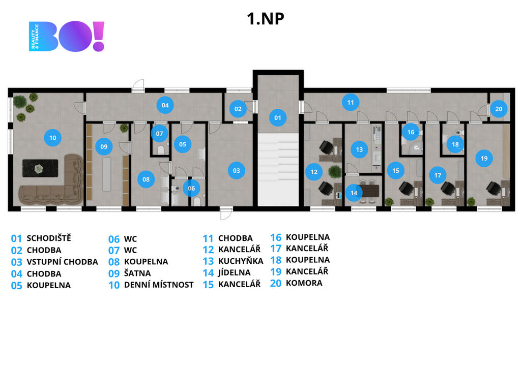 • Prostor pro Vaše nápady: Dvoupatrová cihlová budova nabízí 10 světlých kanceláří, 5 koupelen a 6 samostatných toalet – maximální komfort a pohodlí pro Vás i Váš tým.