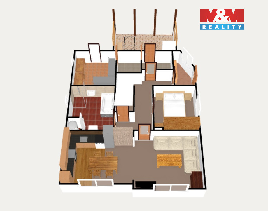 V přízemí je spojovací chodba, obývací pokoj propojený s kuchyní a jídelnou, koupelna s vanou i sprchou, ložnice, toaleta a dílna. V patře najdete čtyři prostorné pokoje, další toaletu a půdu, kterou lze po úpravách využít jako obytný prostor. Dům je vytápěn tepelným čerpadlem, napojen na elektřinu, veřejný vodovod a kanalizaci. Je v dobrém stavu, bez nutnosti rekonstrukce.