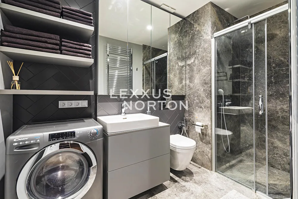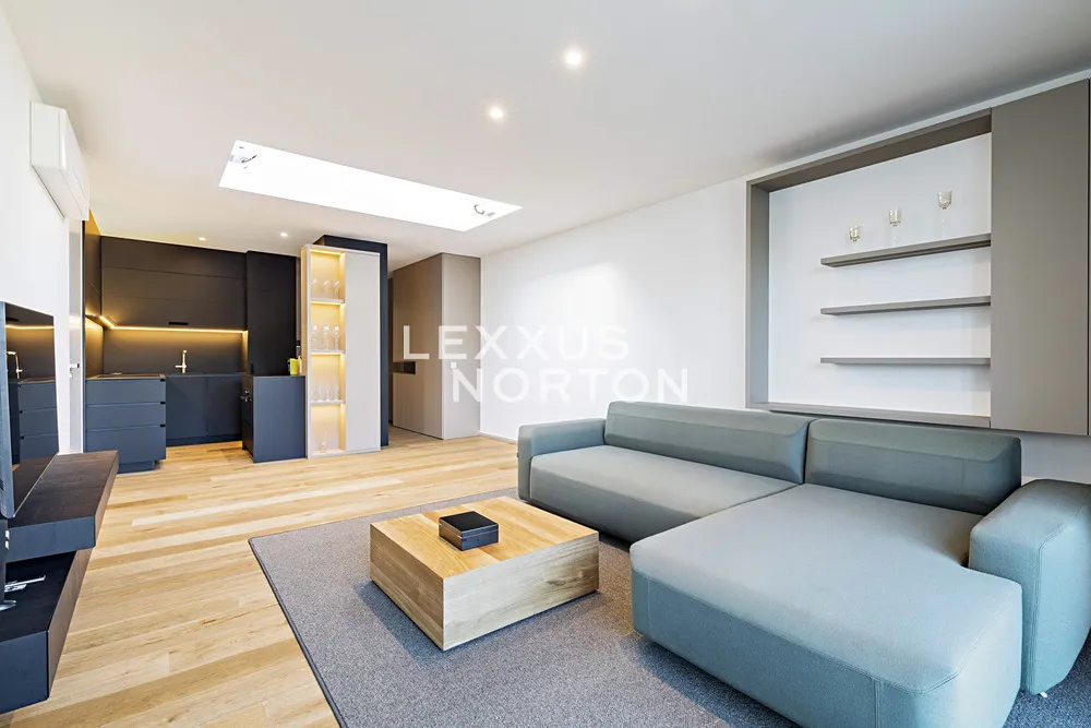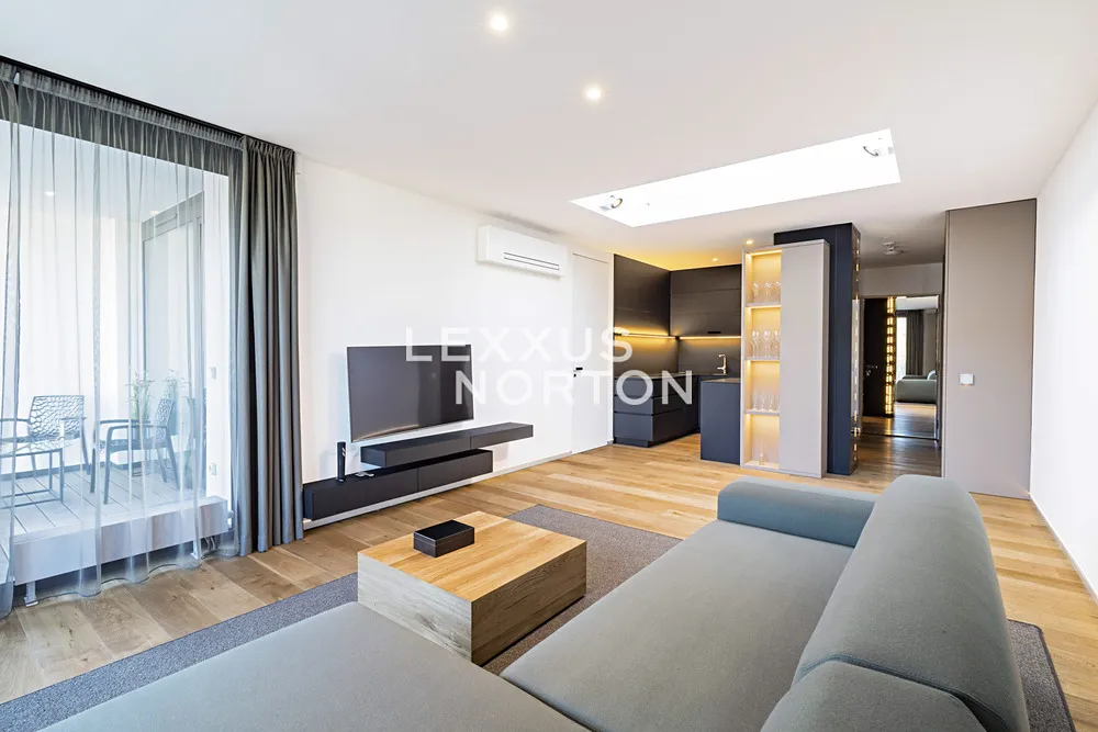 Disponující vstupní halou, obývacím pokojem s komfortní sedací soupravou, vybaveným kuchyňským koutem (sporák, trouba, lednice, mrazák, myčka nádobí, mikrovlnná trouba) a vstupem na lodžii (9 m2). Byt dále nabízí útulnou ložnici také se vstupem na lodžii s prostornou šatnou a moderní koupelnu (sprchový kout, pračka a sušička). K bytu náleží sklep i garážové parkovací stání.