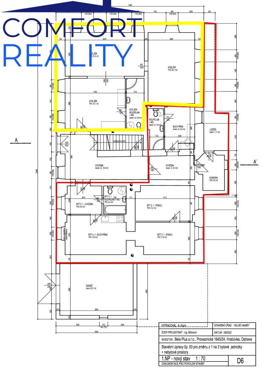 Nabízíme exkluzivně k prodeji rodinný dům se 3 byty a ateliérem. V 1. NP se nachází ateliér s koupelnou a WC o podlahové ploše 66 m2 a byt o dispozici 2+1+šatna se dvěma koupelnama a WC o podlahové ploše 74 m2. Ve 2. NP se nachází dva byty po částečné rekonstrukci-byt 2+1+šatna o podlahové ploše 69 m2 a byt 2+1+komora+šatna a dvě koupelny s WC o podlahové ploše 101 m2. Sklep, kde je technické zázemí má podlahovou plochu 183 m2. Objekt lze využívat k bydlení, pronajímání nebo jako sídlo firmy.