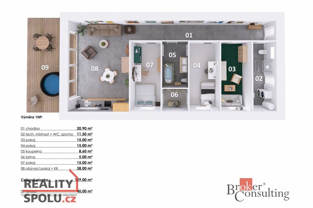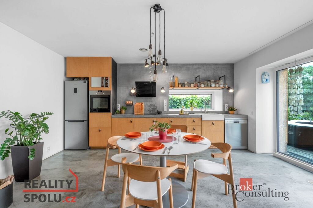 -dům, který má styl: kombinace přiznaného betonu, dřeva a barevných detailů vytváří originální atmosféru. Dispozičně je to 4kk s praktickou šatnou a technickou místností se sprchou pro očistu miláčka. Ať už jím je čtyřnohý kamarád nebo milované kolo. Podlahová plocha přízemí 129 m²