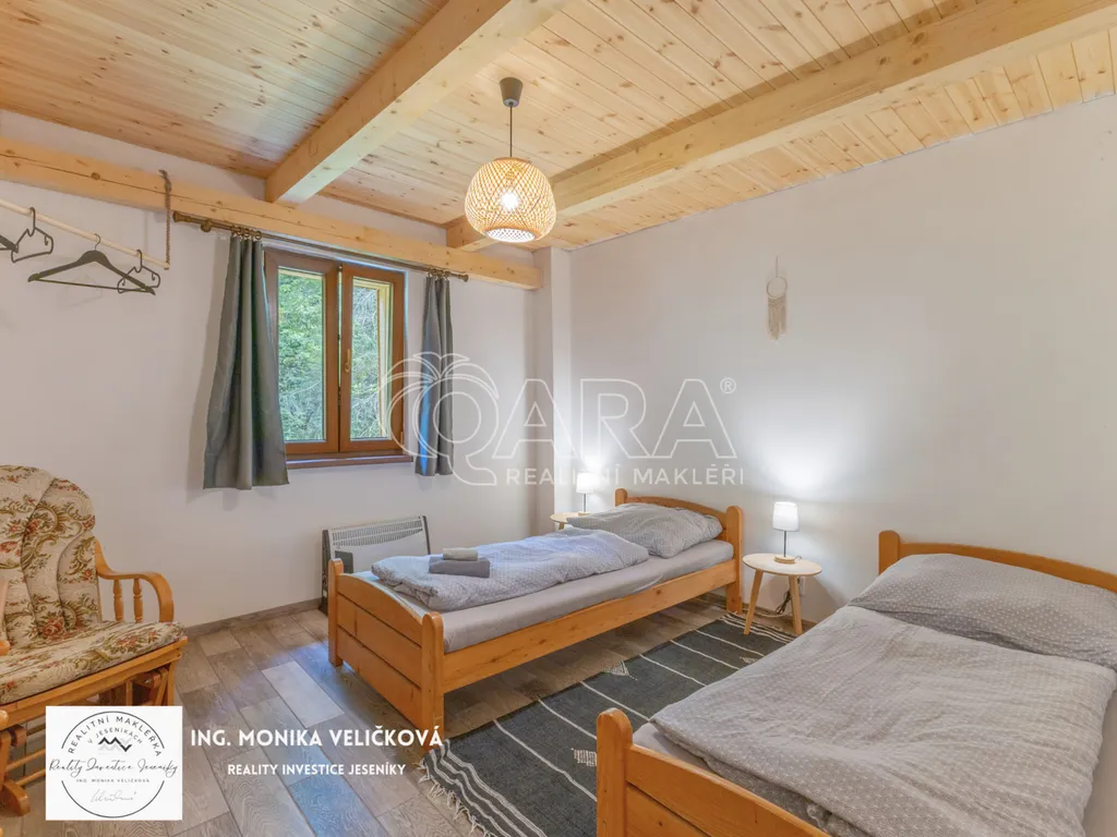 Chalupa stojí na klidném místě u lesa s vlastním pozemkem, přístupovou cestou a parkováním. Výborná dostupnost – Jeseník 10 min, Mikulovice 5 min, Ostrava 2 h, Olomouc 1,5 h.