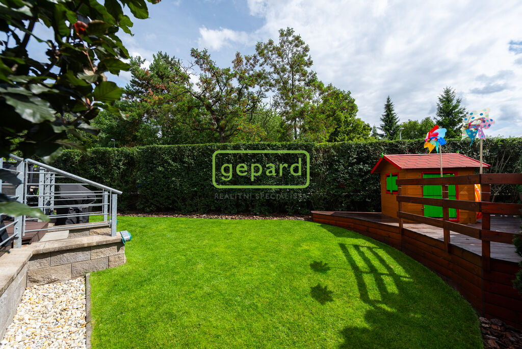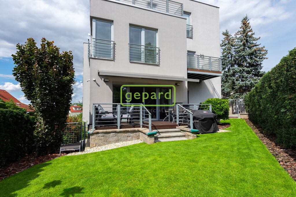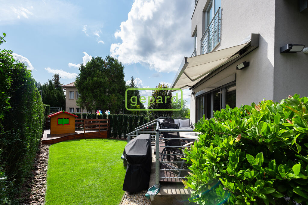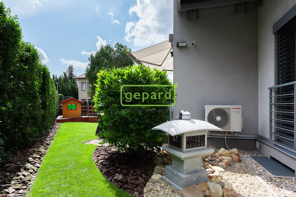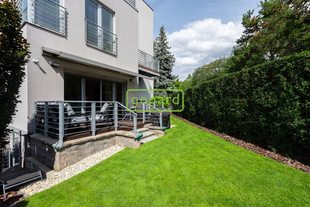 Zvláštní pozornost si zaslouží i zahrada, protože nabízí komfort v užívání bytu hlavně v létě. Samostatným vstup přímo z ulice, plot řešený tak, aby poskytoval obyvatelům dostatečnou intimitu a pocit soukromí. Tráva má vlastní automatické zavlažování, dekorativní keře, fontána a krmítko pro ptáčky umístěné tak, aby si zejména děti mohli na něj užívat pohled oknem, přímo z jídelny.
