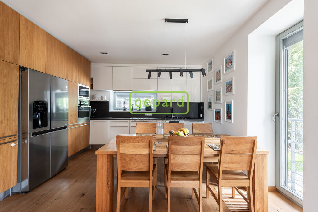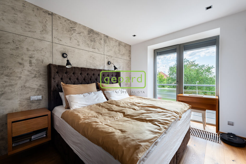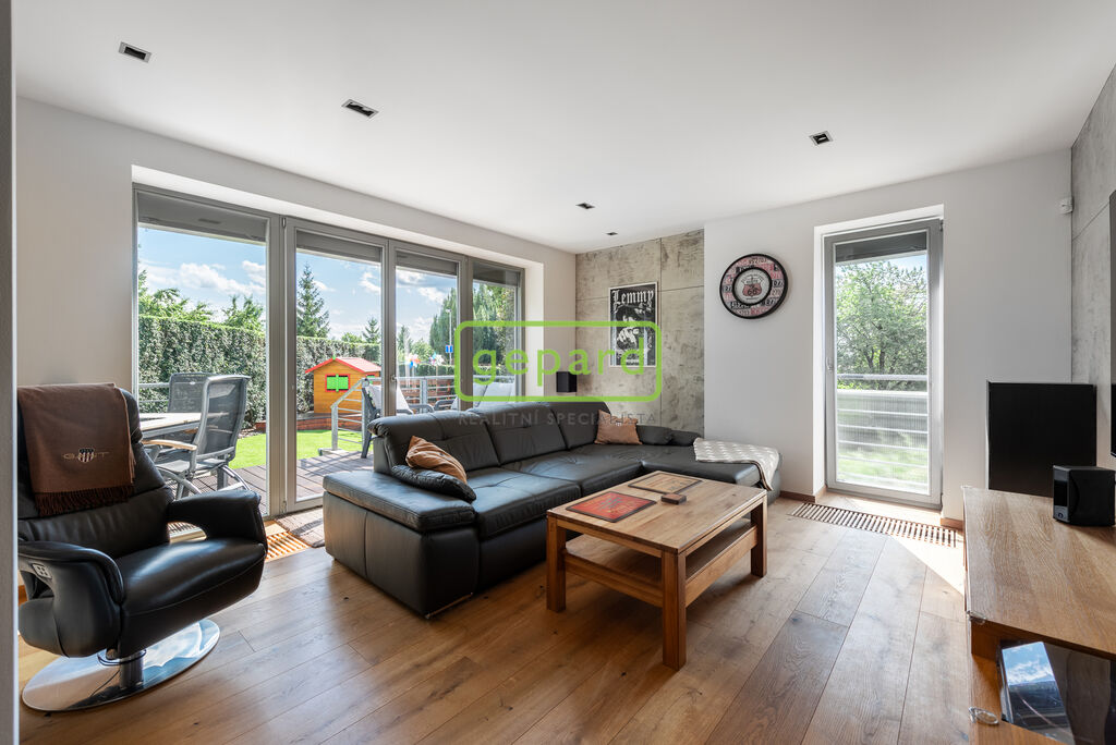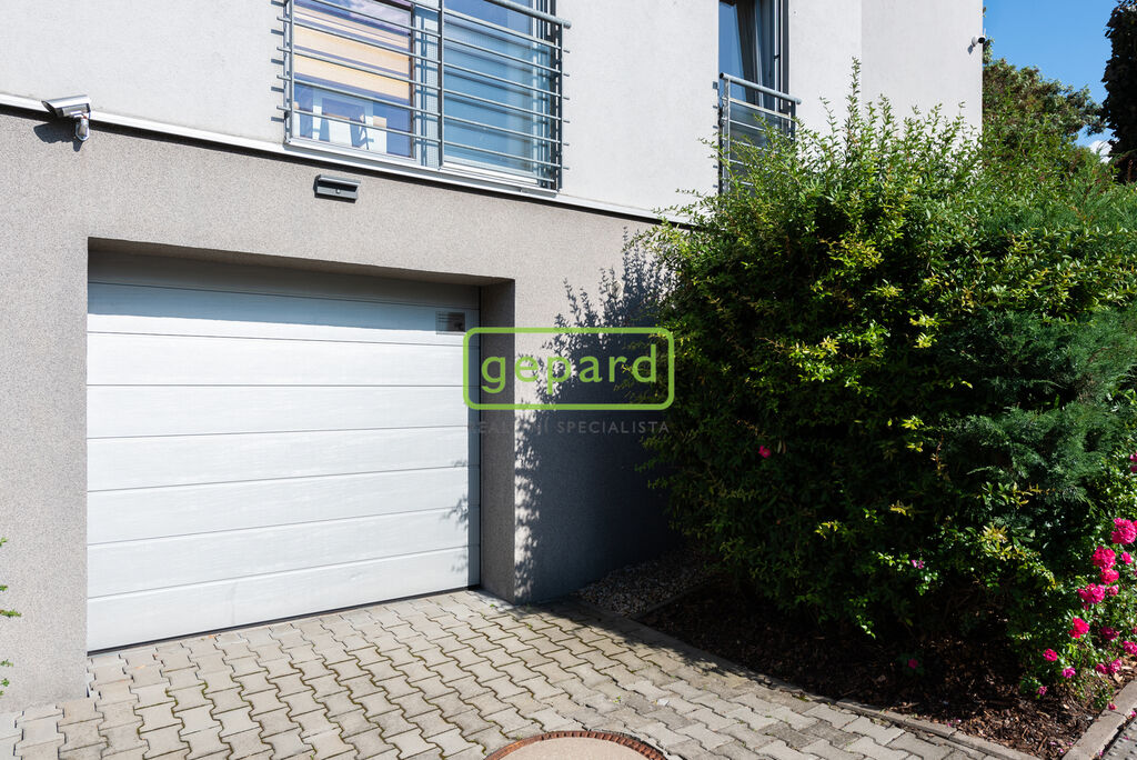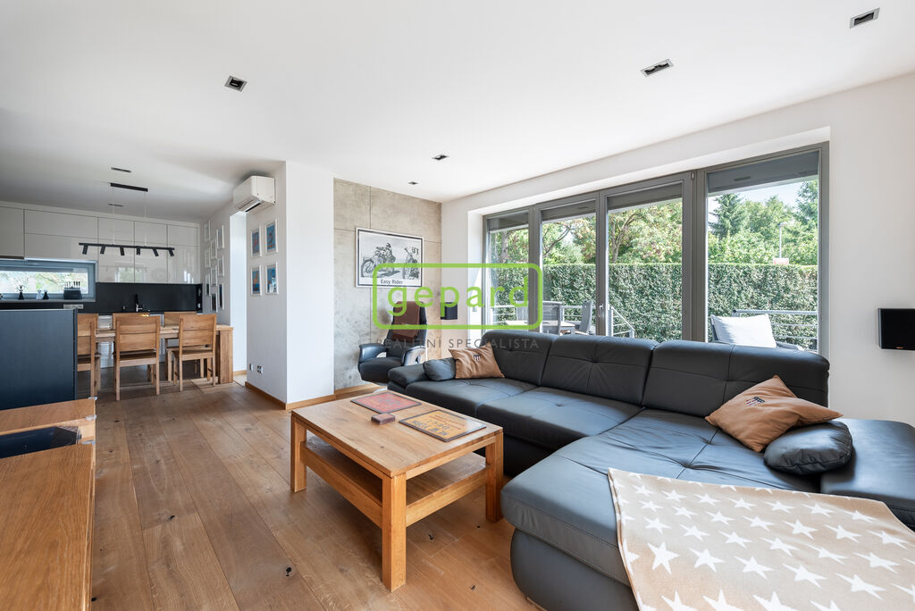 Byt je po kompletní kvalitní rekonstrukci, která klade důraz na design a praktické bydlení. Z hlediska bezpečnosti je v bytě i garáži alarm a venkovní kamerový systém zabírající branku, zahradu a prostor před garáží. Je zde instalovaná klimatizace, předokenní elektricky dálkově ovládané zámkové žaluzie, dřevěná podlaha v celém bytě v dubovém dekoru, k tomu vestavné skříně v ložnicích a předsíni i kuchyňská linka, vše na míru. Stěny v obývacím pokoji a v ložnici zdobí dekorativní stěrky. Podhledy jsou s bodovým osvícením.