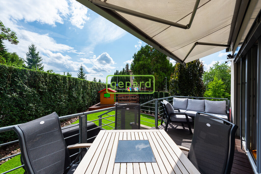 Terasa s přímým vstupem z obývacího pokoje je díky francouzským oknům opticky propojena přímo s bytem. Klidné místo pro relaxaci a trávení volného času, posezení nejen s přáteli, grilování, či opalování, ale je zde také prostor vyžití pro děti. Výsuvná markýza Vás dostatečně ochrání před sluncem, pokud chcete. V případě špatného počasí nebo silného větru se automaticky zatáhne, aby se zabránilo jejímu poškození.