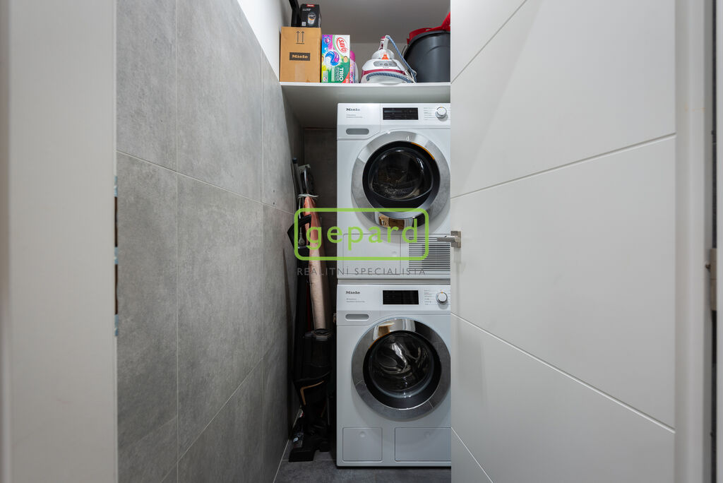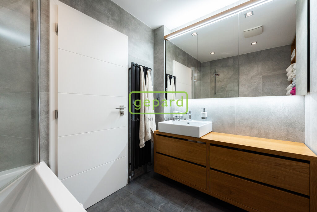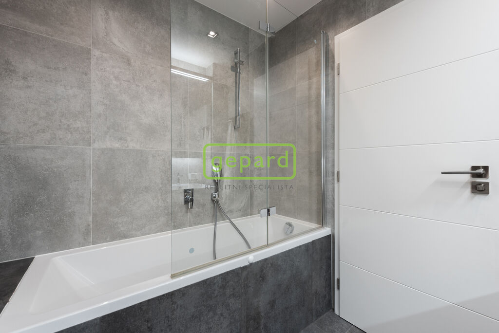 V rámci rekonstrukce byla z místnosti pro WC vytvořena technická místnost pro pračku se šušičkou. Koupelna je s vanou, společná s WC, s úložným prostorem na míru, pro ručníky a hygienu. Vana disponuje skleněnou zástěnou pro sprchu.