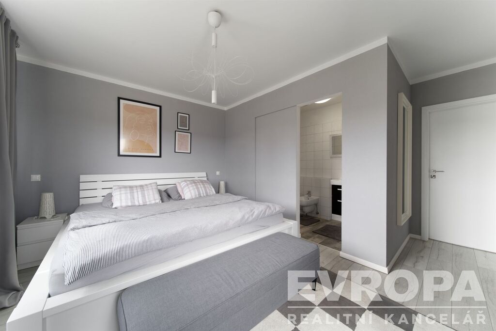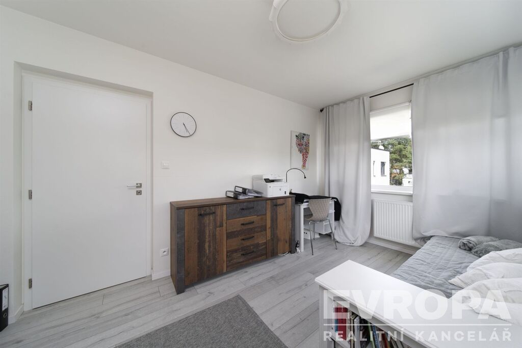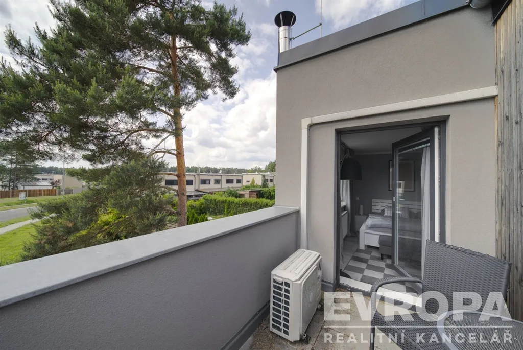 V druhém nadzemním podlaží je hlavní ložnice s vlastní koupelnou a šatnou, která se dá využít jako samostatný dětský pokoj. Z ložnice i z šatny je samostatný výstup na balkón nad terasou. Na patře dále najdeme hlavní koupelnu a pokoj.