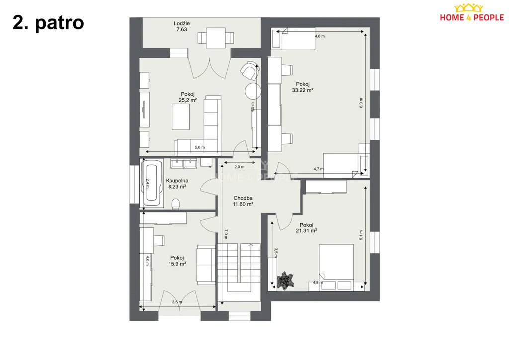 V 1.NP jsou 4 pokoje: pokoj 1(15,93 m²),pokoj 2(25,20m²),pokoj 3(33,22m²),pokoj 4(21,31m²) se vstupem na balkón (7,63m²) ,prostorná chodba (16,45m²)a velká koupelna s vanou.