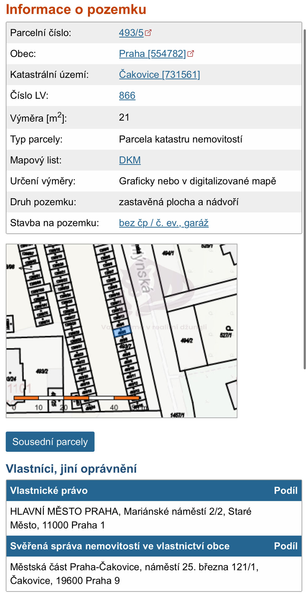 stavba bez čp / č. ev., garáž, na pozemku p. č. 493/5, pozemek města, tedy ve vlastnictví hl.m. Prahy, pod správou obce, smlouva na dobu neurčitou, nájemné za pozemek cca 2-3.000 Kč ročně.