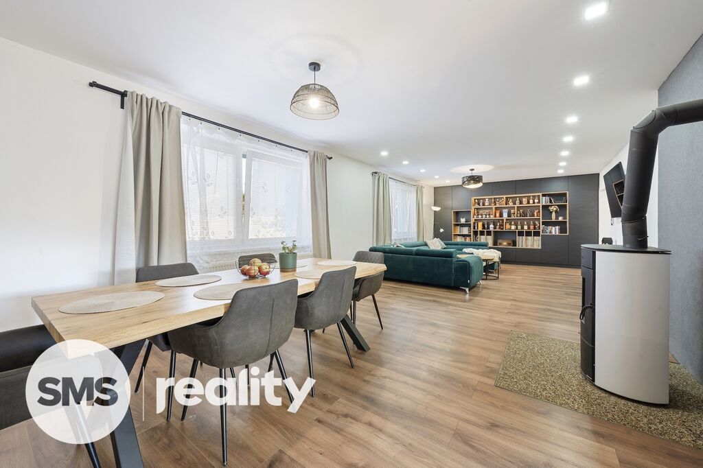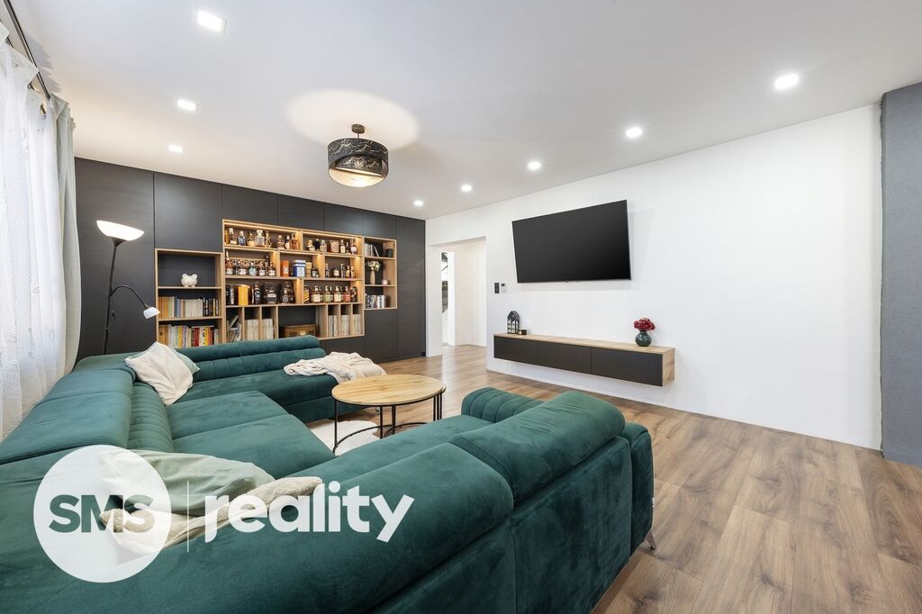 Obývací pokoj: prostorný, světlý, s krbovými kamny, které dodávají interiéru příjemnou atmosféru. Součástí je nadstandardní vestavná knihovna a pohodlný designový gauč.