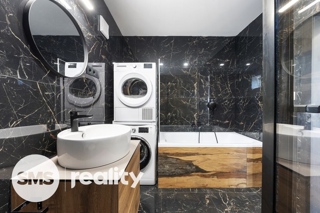 Koupelna: elegantní a nadčasová, vybavená sprchovým koutem, vanou a podlahovým vytápěním pro maximální komfort.