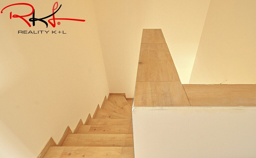 • Podlahy: dlažba v dekoru světlého dubu (chodba, koupelny), betonová připravená pro finální povrch (ostatní místnosti)