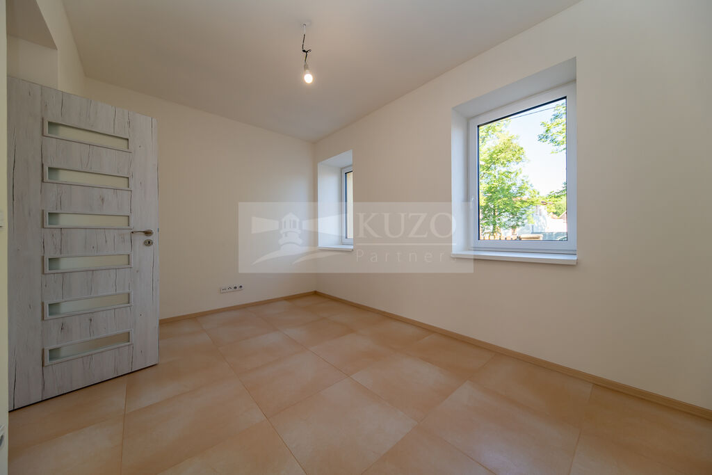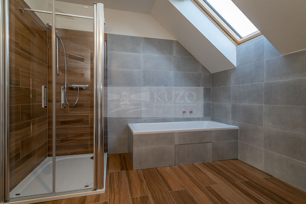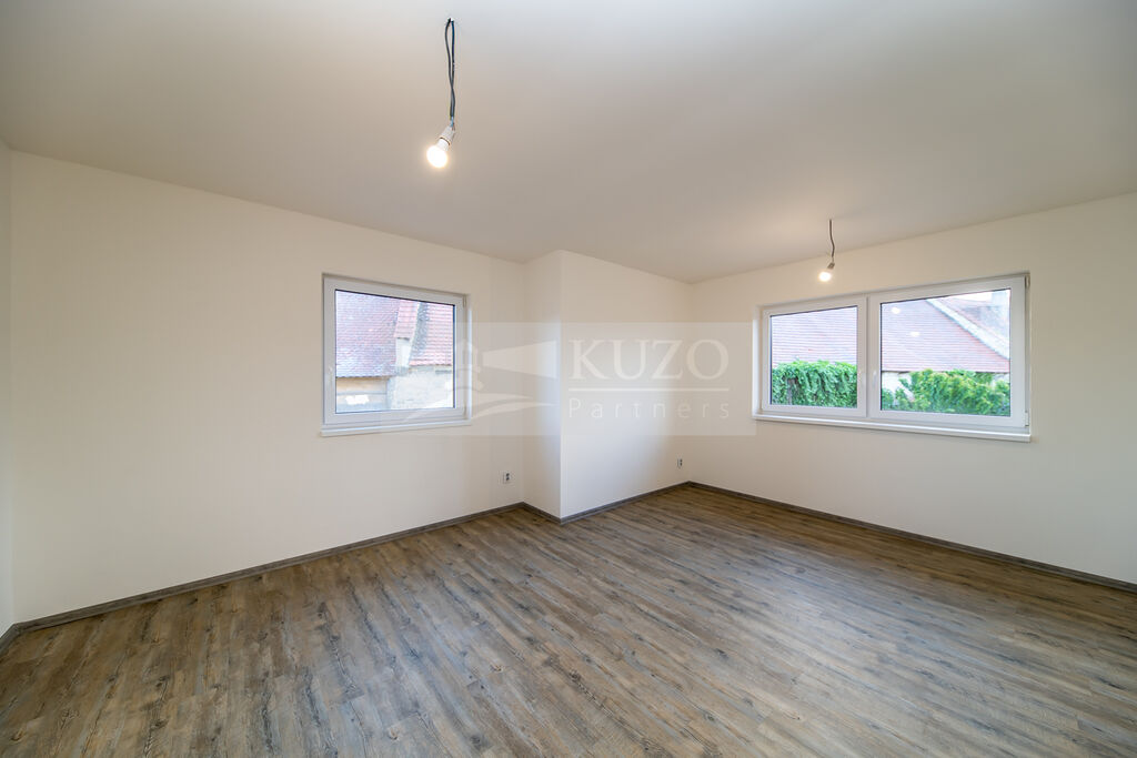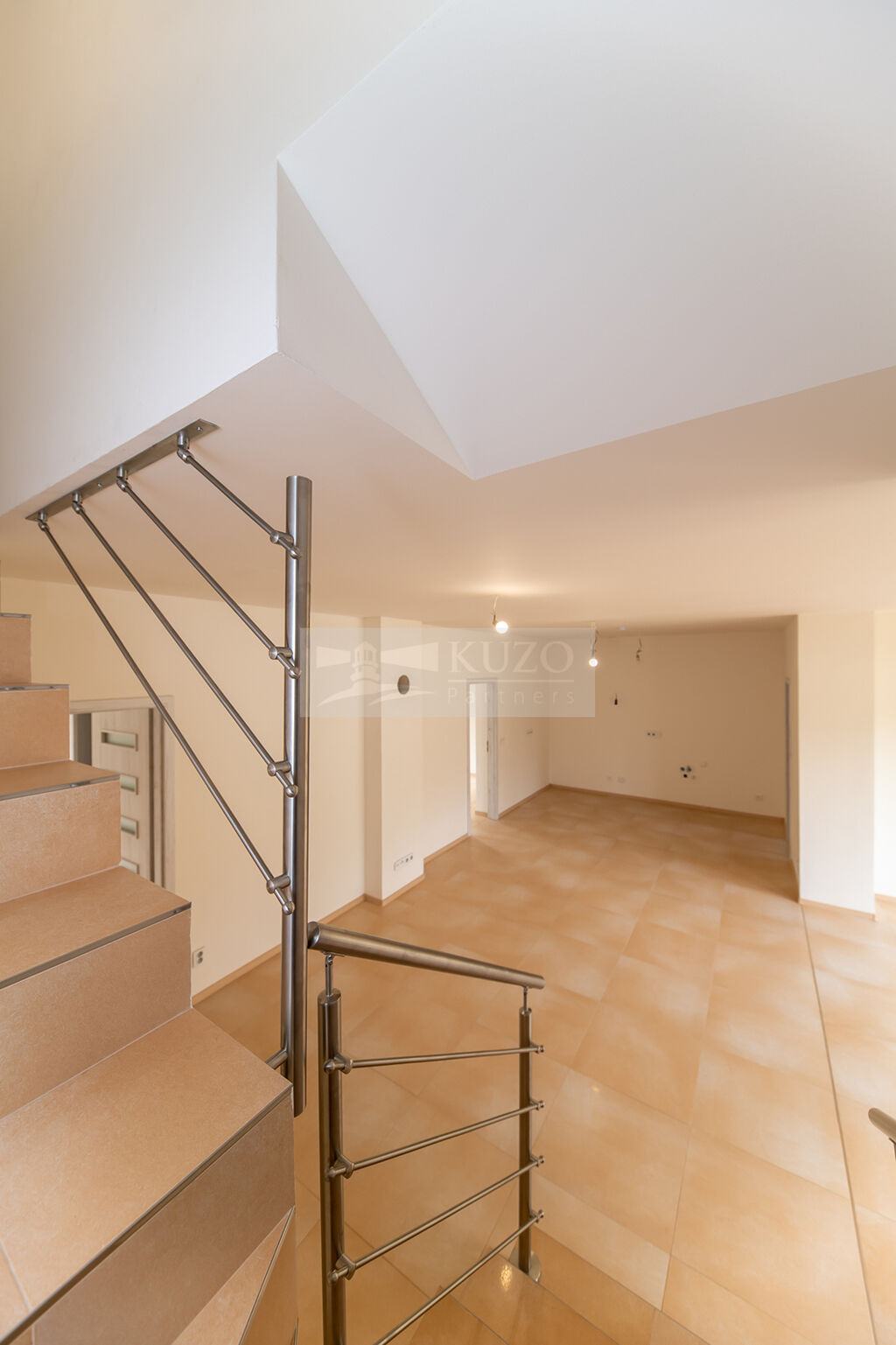 V nemovitosti se nachází velký obývací pokoj, který je propojen s moderně vybavenou kuchyní. Z obývacího pokoje se vstupuje na prostornou terasu (20 m²) a do zahrady, která nabízí bezpečné místo pro děti k hraní a relaxaci. Tato zahrada je ideálním prostorem pro rodinné grilování nebo odpočinek na čerstvém vzduchu, zatímco děti se mohou vyřádit na trávníku.