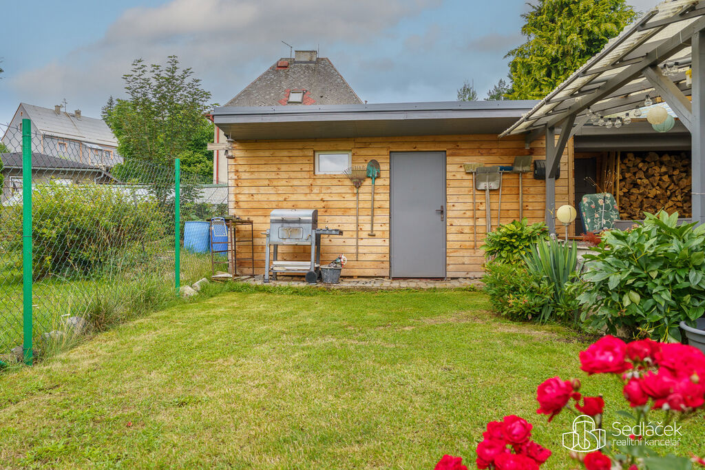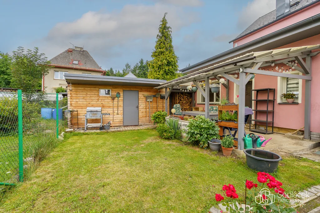 Zahrada je rovinatá a udržovaná, za domem je terasa s posezením, zahradní domek a přístřešek pro auto.