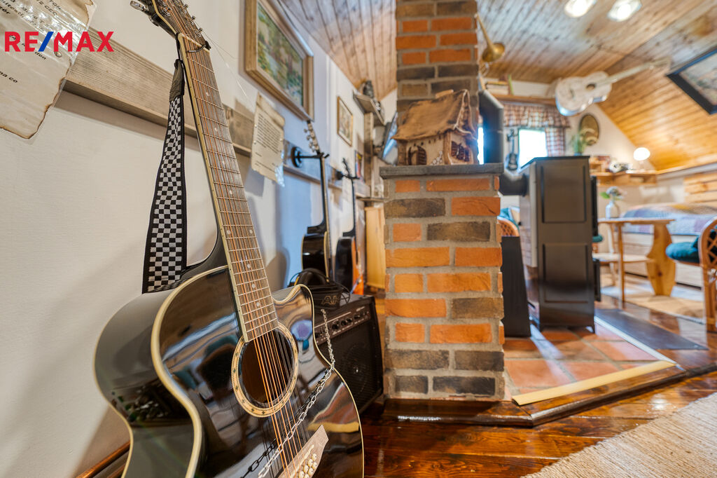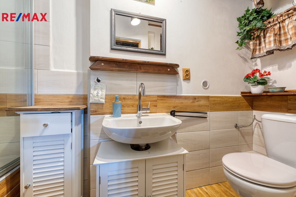 Druhý vchod vede do chodby, z níž je přístup do koupelny, kuchyně, sklepa a na schodiště do horního patra. V patře se nachází druhá koupelna s toaletou, pokoj využívaný jako prodejna keramiky a prostorná ložnice s pracovním koutem.