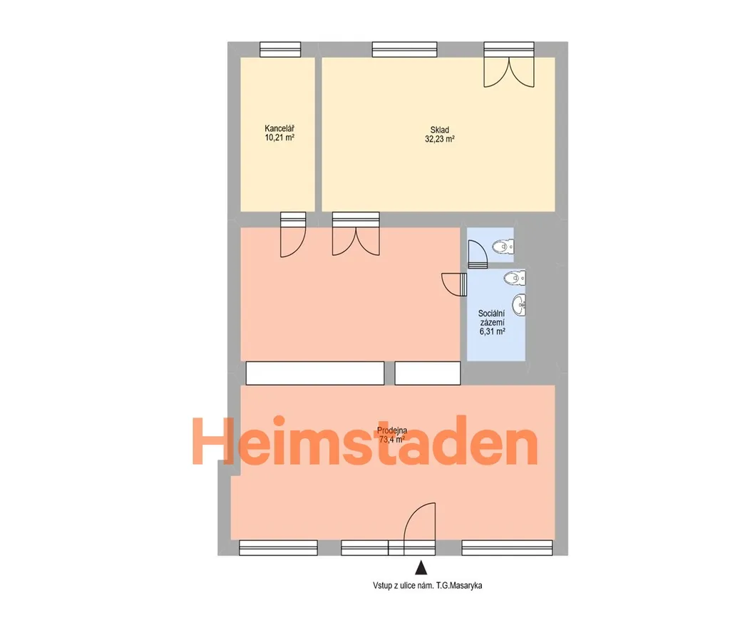 Prostor disponuje přímým vstupem z náměstí a velkými výlohami orientovanými do ulice, které zajišťují výbornou viditelnost a přirozené denní světlo. Samozřejmostí je sociální zázemí a zadní vstup pro zásobování. V okolí je dostatek parkovacích míst pro zákazníky i personál.
