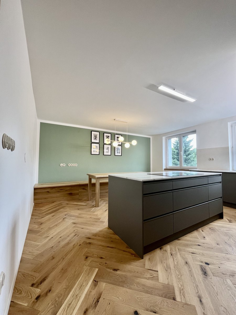 Součástí kuchyně je plně vybavená linka s vestavěnými spotřebiči (myčka, mikrovlnná a elektrická trouba, digestoř, sklokeramická varná deska), kuchyňský ostrůvek a jídelní stůl s lavicí a úložným prostorem.