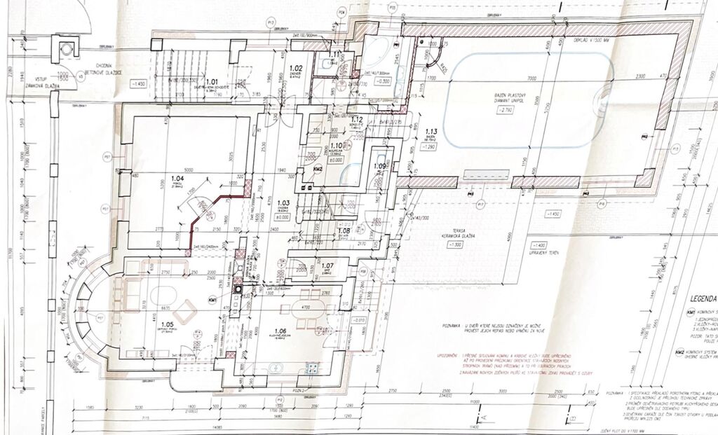 V 1.NP - zádveří s vestavěnými skříněmi, prostorná chodba, obývací pokoj s krbem, jídelna a navazující, moderní kuchyně s francouzským oknem a výhledem do zahrady. Z chodby je rovněž vstup do prostorů koupelny, sauny, vnitřního bazénu s protiproudem a sklepních prostorů. Z 1.NP se nádherným, původně zachovaným schodištěm dostanete do 2.NP. V obou patrech včetně mezipatří se nachází prostorné komory.