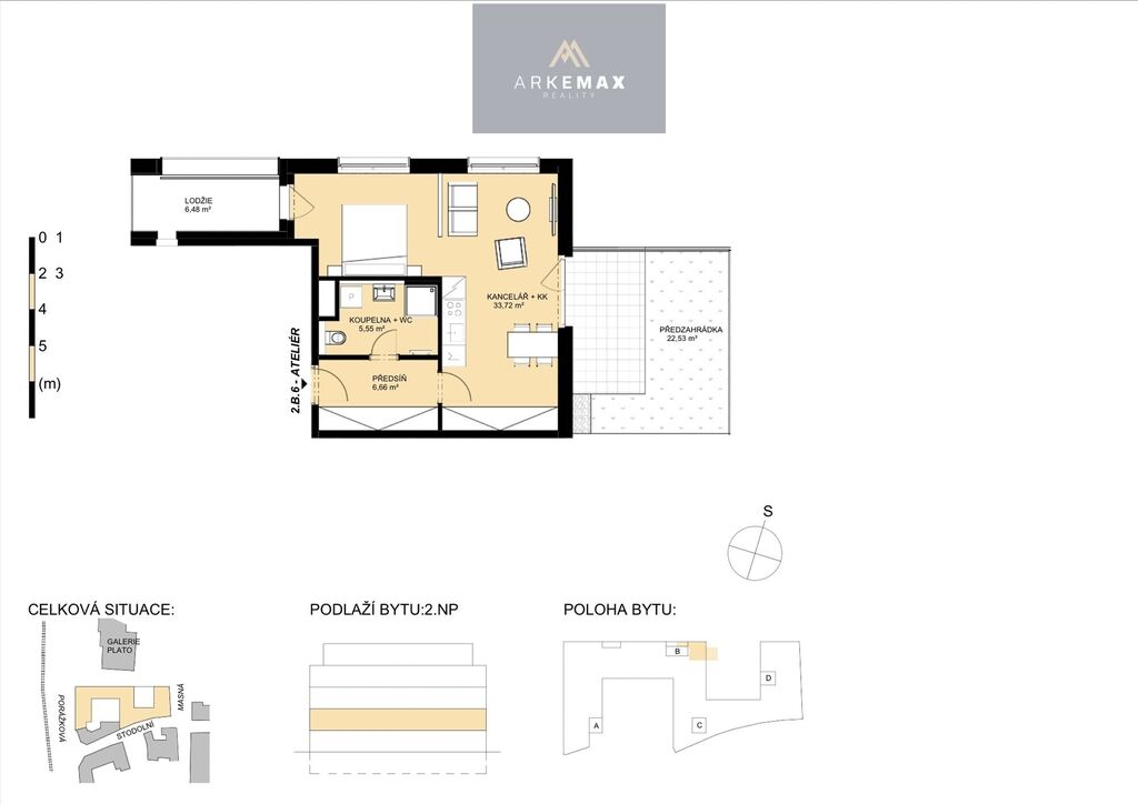 Jednotka je vedena jako ateliér (2+kk) o podlahové ploše 47,91 m² a nachází se ve 2. nadzemním podlaží.