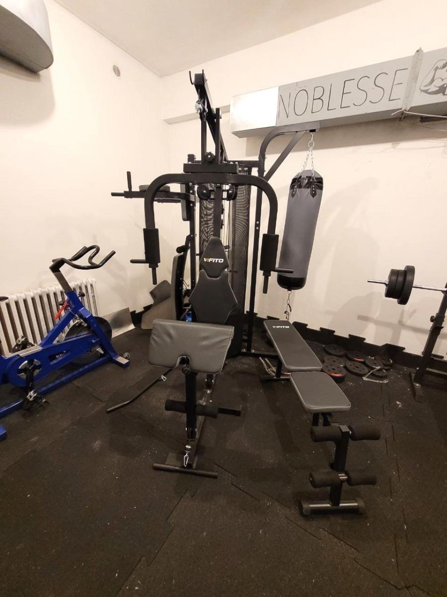 Součástí vybavení je běžecký pás, boxovací pytel, lavice na benchpress, bradla, multifunkční věž, švédská stěna a další.