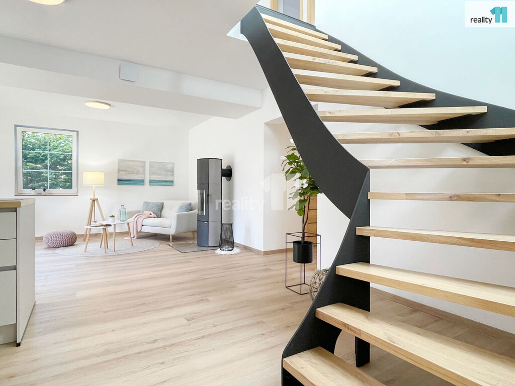 Již při vstupu Vás okamžitě zaujme prostorné, slunné zádveří a otevřený koncept obývacího pokoje propojeného s na míru realizovanou kuchyní. Kuchyňská linka je vybavena všemi moderními spotřebiči – indukční varnou deskou, zabudovanou troubou, mikrovlnkou, myčkou, prostornou lednicí s mrazákem – a nechybí ani stylový kuchyňský ostrůvek, kolem kterého se bude odehrávat život celé rodiny. Světlá podlaha a velká okna vnášejí do domu radostnou atmosféru a propojují interiér se zelení za okny.