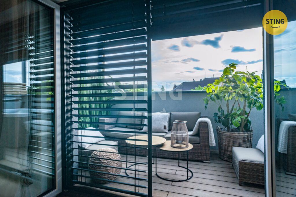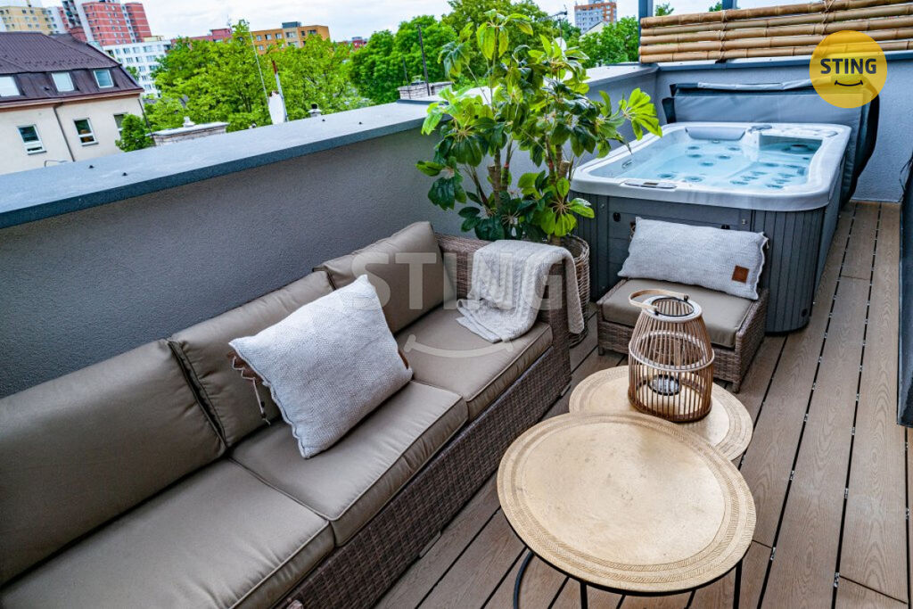 Z obývací části je přímý vstup na zastřešenou terasu s útulnou vířivkou a posezením, odkud je výhled na Ostravu. Ideální místo pro relax, večerní drink nebo ranní kávu.