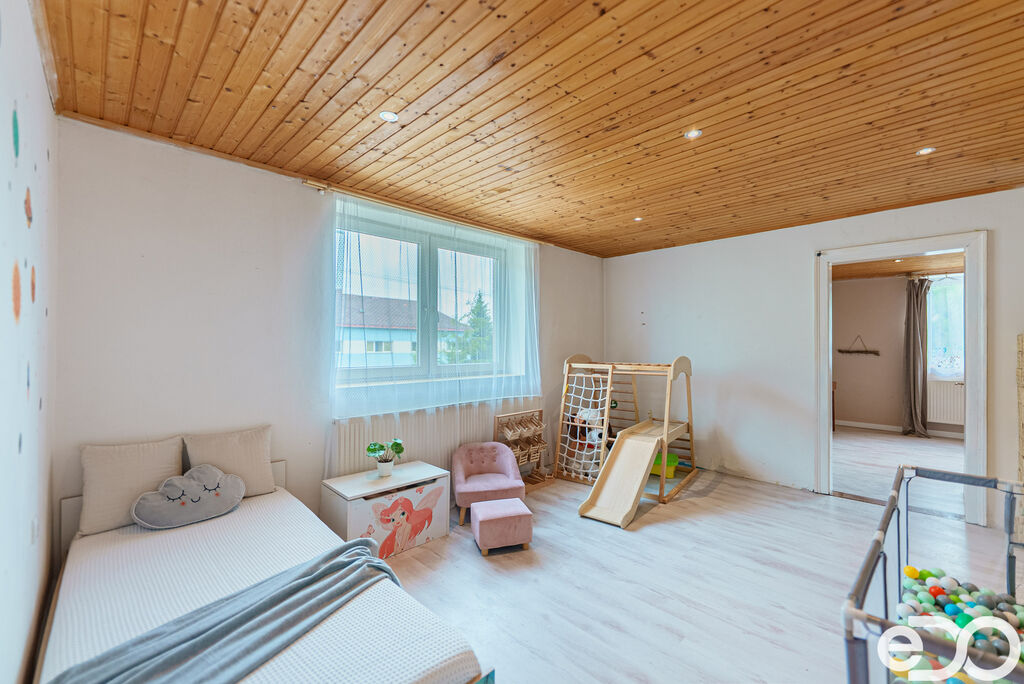 V patře se nachází ložnice, dětský pokoj, dvě komory a místnost zkolaudovaná jako fotoateliér. Tento prostor nabízí ideální podmínky pro domácí podnikání, kreativní činnost nebo tiché soukromí pro práci. Světlo, klid a dostatek místa dávají tomuto patru další dimenzi využití.