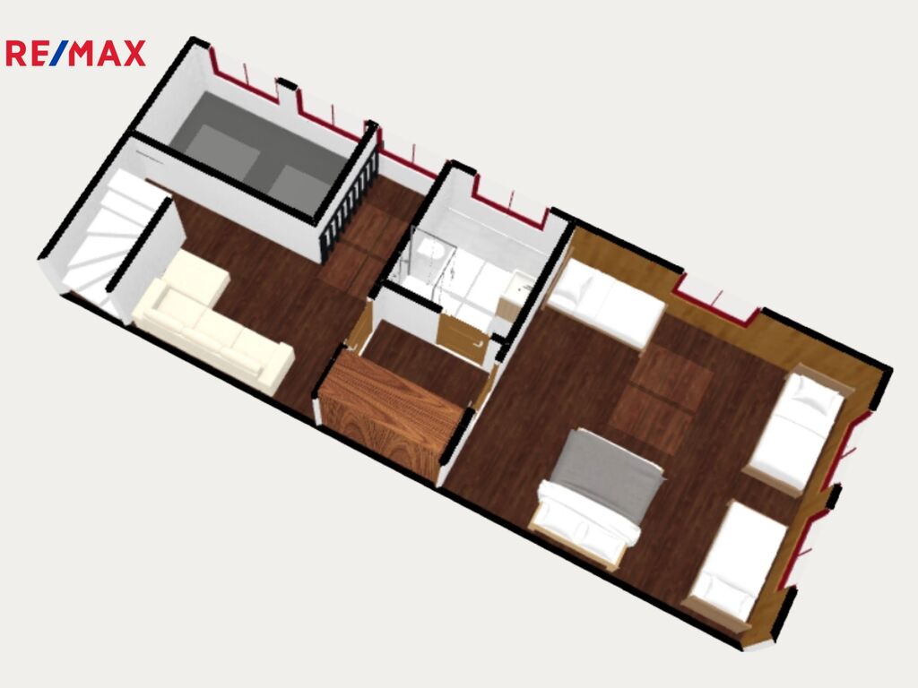 Byt má rozlohu 120 m² a je kompletně vybavený včetně spotřebičů i nábytku. V přízemí se nachází průchozí kuchyně (lednice, mrazák, indukční deska, horkovzdušná trouba) s přístupem do zahrady, otevřené atrium, samostatná ložnice, obývací pokoj a koupelna se sprchovým koutem. V patře je další ložnice, druhá koupelna se sprchovým koutem a atrium se sedací soupravou, které lze využít jako druhý obývací pokoj nebo knihovnu.