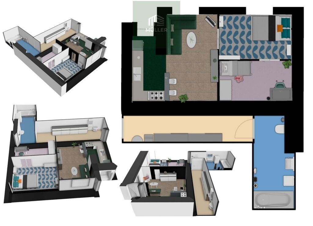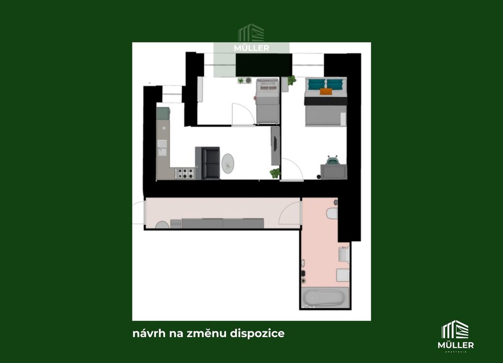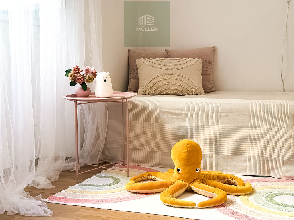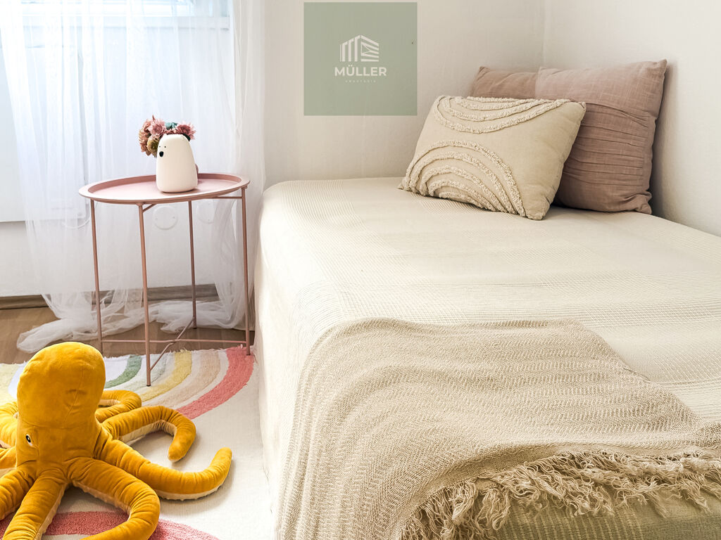 Prokoj je rozdělený sádrokartonovou příčkou (lze snadno odstranit) na dětský pokoj s oknem o velikosti 9 m2 a další místnost o velikosti 10 m2, která může být využita jako pracovna šatna nebo ložnice.