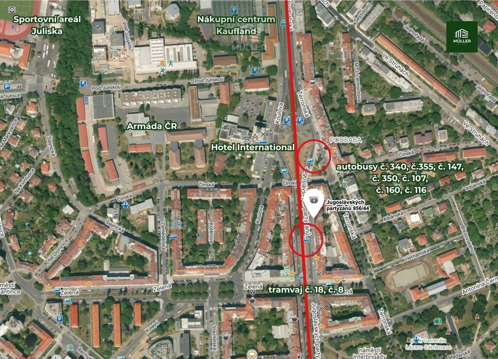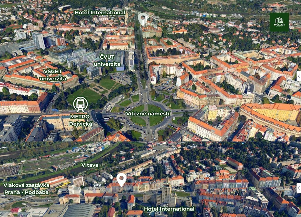 V sousedství univerzit (ČVUT, VŠCHT), hotelu International, obchodů, kaváren a restaurací.