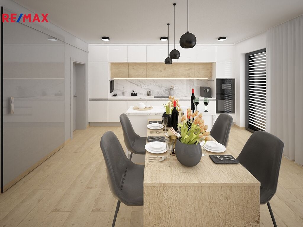 Dům o dispozici 5+kk o podlahové ploše 182,3 m² nabízí dostatek prostoru pro velkou rodinu i komfortní zázemí pro práci z domova. K domu patří dvojgaráž pro 2 vozy a další 2 venkovní parkovací stání.