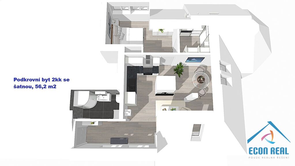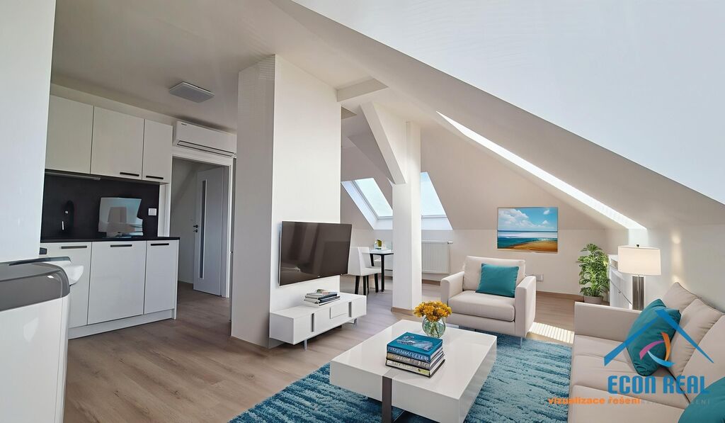 Zajímavý a světlý, podkrovní byt 2KK o výměře 56,2 m2 se nachází ve 3 NP (2. patro) této historické vily a nabídne svým obyvatelům nejen příjemný výhled, ale prostornou předsíň, zajímavý obývací pokoj (29,2 m2) s plně vybaveným kuchyňským koutem (myčka, lednička s mrazákem, trouba, digestoř, dřez s baterií, elektrická varná deska), světlou a vzdušnou ložnici (11,2 m2) se vstupem do samostatné komory/šatny (7,5m2), koupelnu se sprchovým koutem, toaletou, umyvadlem, zrcadlovou skříňkou a přípojkou na pračku, klimatizaci, parkovací místo a uzamykatelnou sklepní kóji 11,3 m2.