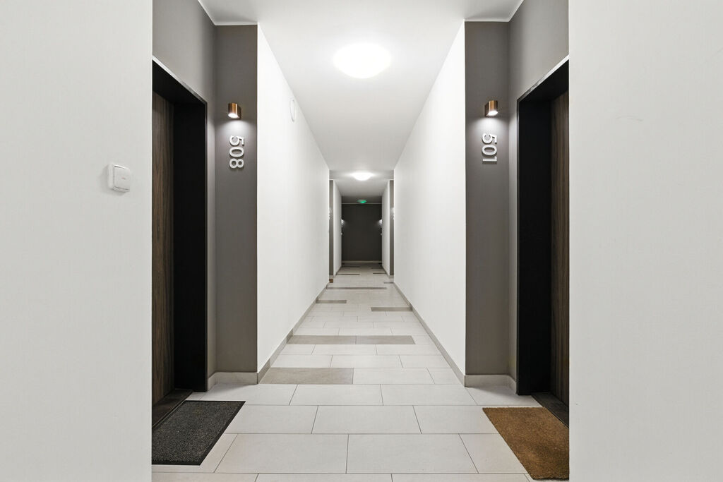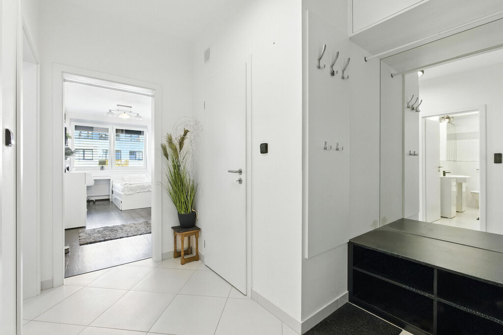 Byt se nachází v 5. patře z celkových 7 a obytnou plochu tvoří předsíň s vestavěnou skříní (botníkem) a prostornou technickou místností, obývací pokoj s kuchyňským koutem na míru včetně kvalitních spotřebičů značky Bosch a AEG, ložnice se vstupem na balkón a koupelna s vanou a WC.