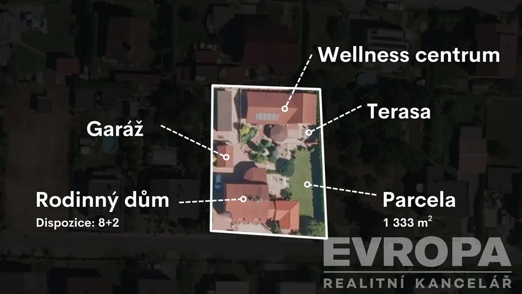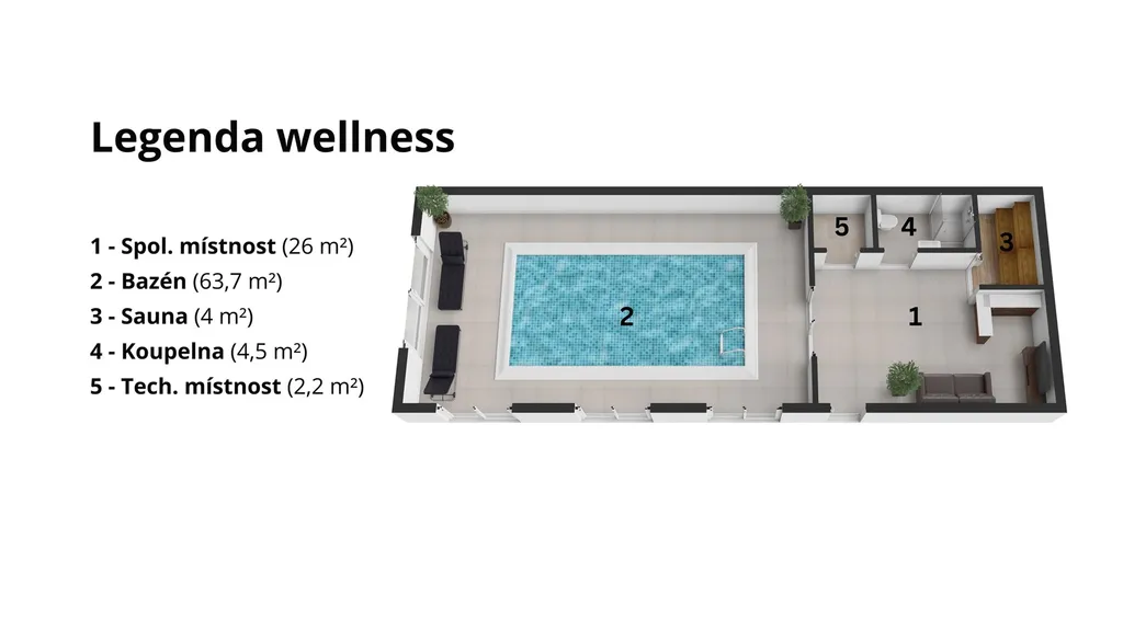 Součástí prodávané nemovitosti je i celoroční wellness centrum s bazénem, saunou i barem pro neomezené možnosti zábavy s přáteli. Wellness je dostupné po celý rok, vytápěno podlahovým topením pro neomezený pocit tepla od nohou, klimatizováno, částečně napájeno elektrickou energií z fotovoltaických panelů i průběžně zbavováno vlhkosti díky instalovanému odsávání. Před wellness je velká terasa pro relaxaci s krásným výhledem do zahrady. To vše přináší pocit luxusu, komfortu a pohody přímo v soukromí vašeho domova.