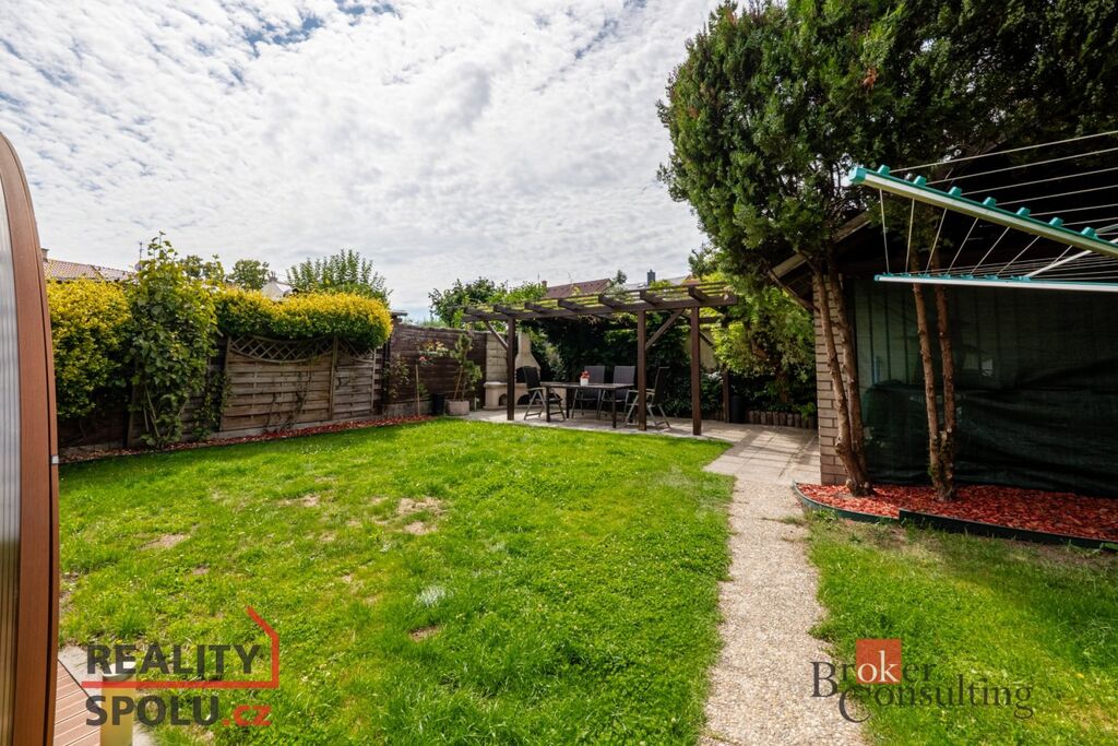 Na zahradu je přístup průjezdem nebo po schodišti z balkonu. Najdete zde zastřešenou vířivku, pergolu s krbem pro příjemné posezení v létě a dřevěný domek na zahradní náčiní.