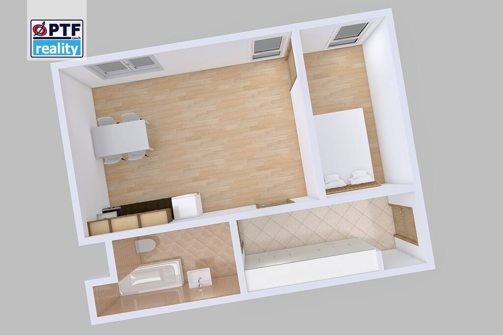 Dispozice zahrnuje prostorný obývací pokoj s kuchyňským koutem, samostatnou neprůchozí pokoj, předsíň a koupelnu s vanou a toaletou.