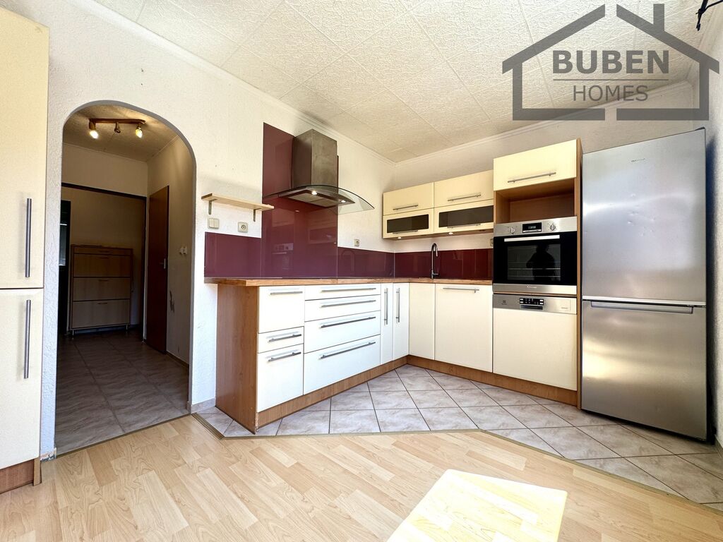 V ceně je zahrnutá kuchyňská linka s vestavěnými spotřebiči (myčka, sklokeramická varná deska - indukce, digestoř, horkovzdušná trouba, lednice a vybavení bytu (viz. foto).